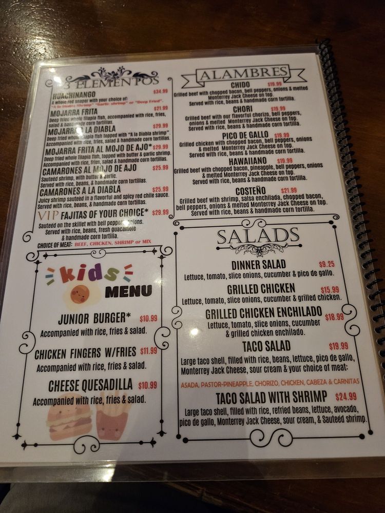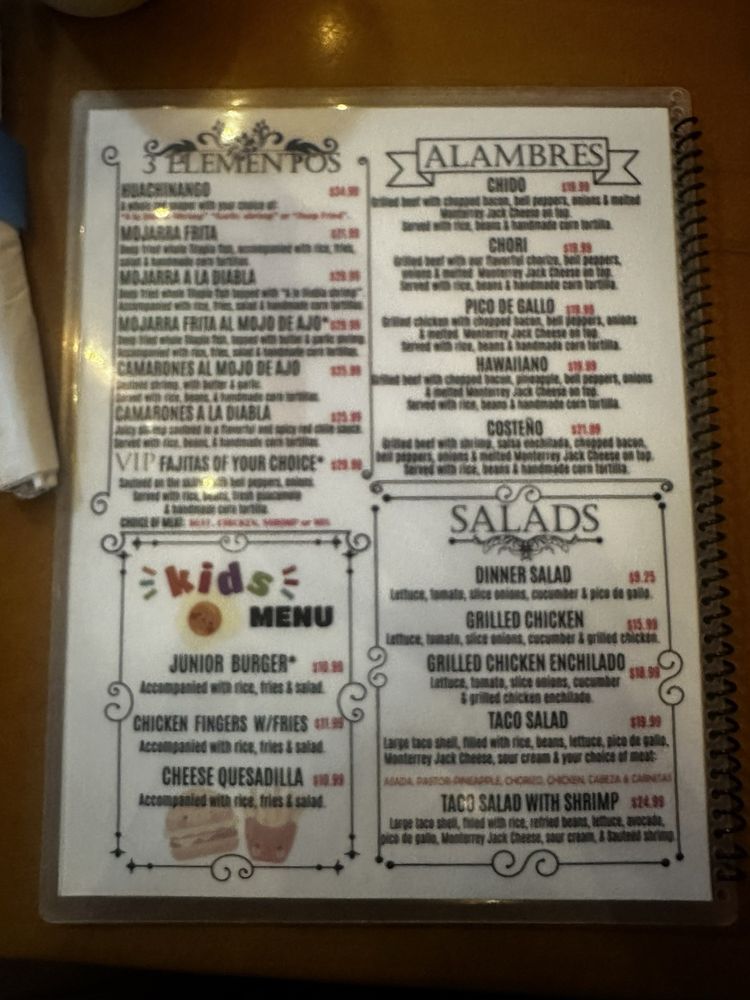 Beef, shrimp and bacon. Includes rice, beans and tortillas.